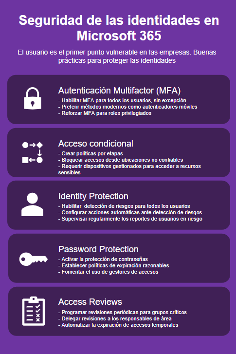 A través de la suite de seguridad en Microsoft Entra, Microsoft proporciona múltiples soluciones para fortalecer la seguridad de las identidades: