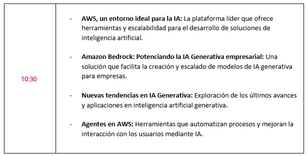 Durante este Tech & Breakfast, veremos cómo puedes aplicar IA para alcanzar una mejora competitiva en tu negocio y saber cómo utilizarla con servicios Amazon Web Services (AWS) como BedRock o SageMaker.